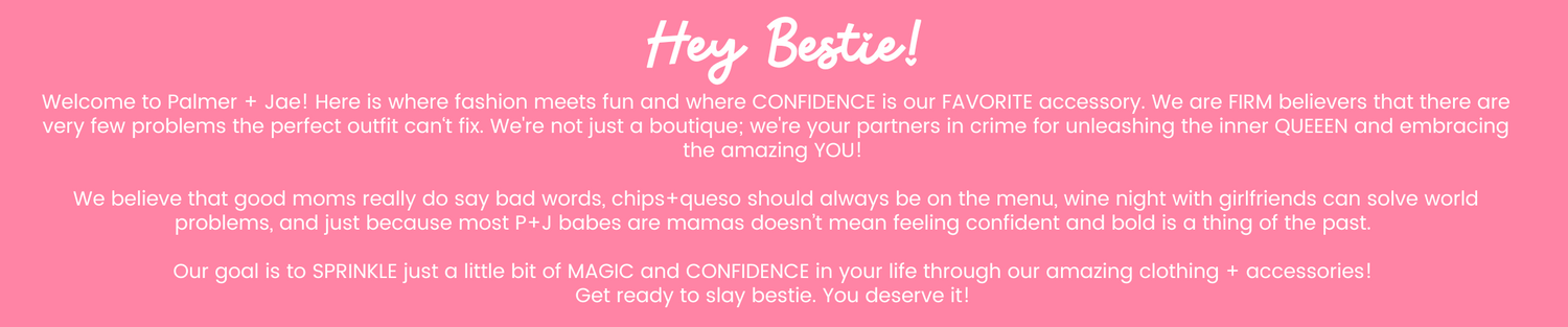 Hey BESTIE! I am Mandi, owner + creator of P+J! I am a mama of TWO wild & crazy girls! Charli Jae & Mayson Palmer (fun face this is where our business name comes from!) Here at Palmer + Jae, we strive meet our customers wherever they are in life. Our vision is to provide a special type of fashion where style meets comfort + affordability.