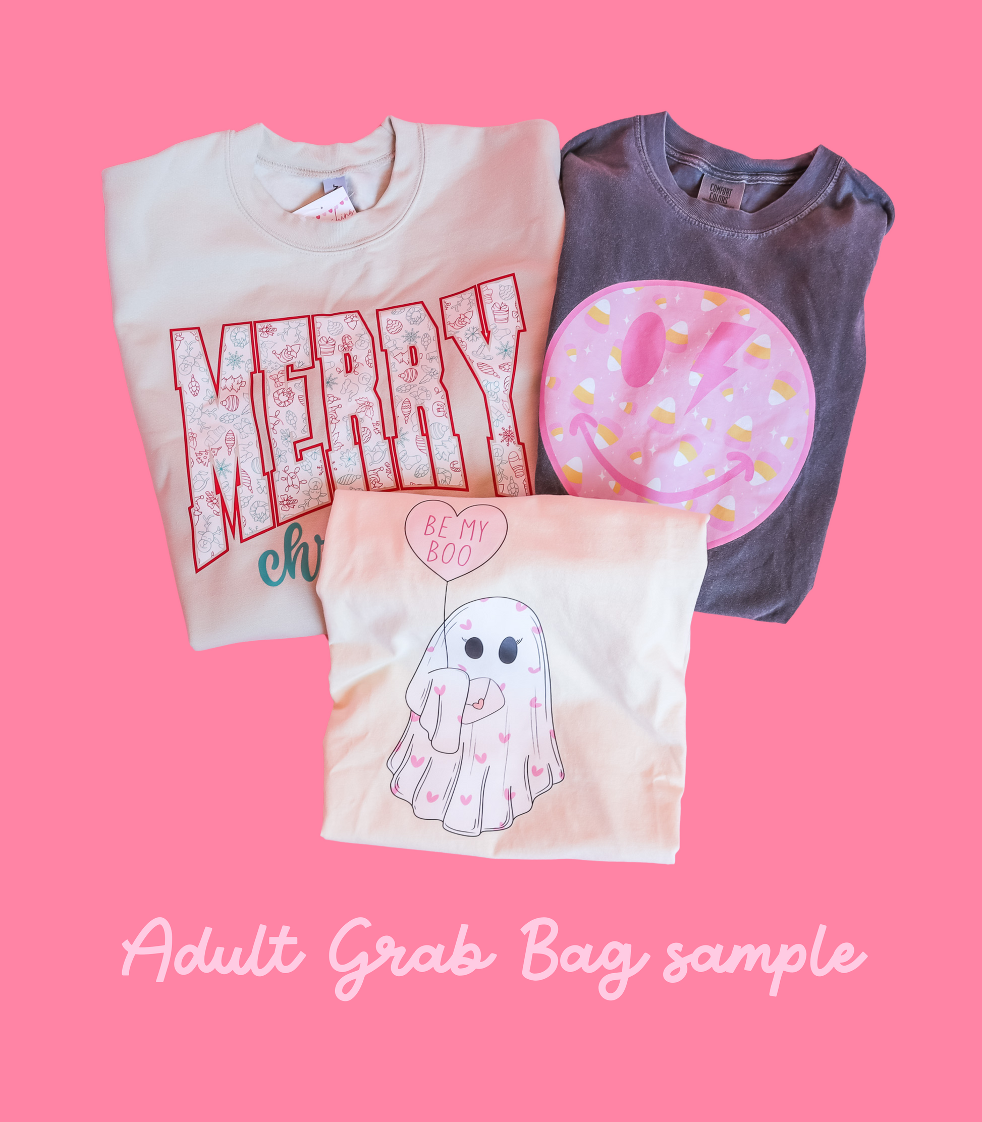 -Grab bags will be combos of sweatshirts, t-shirts, long sleeves, premium items, and everything in between. We will do our best to put together super cute items in each bag consisting of holidays, mama gear or everyday wear!