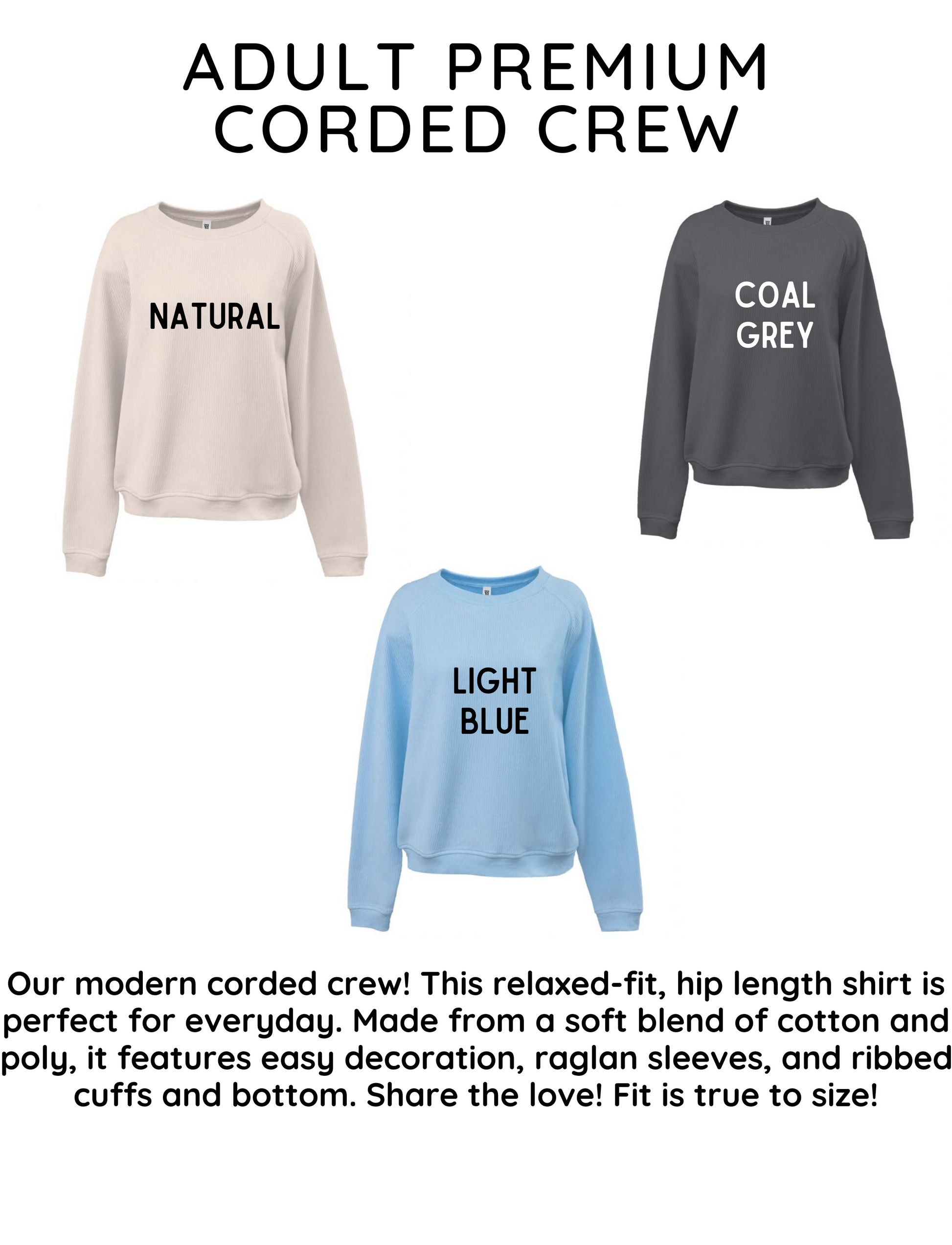Our modern corded crew! This relaxed-fit, hip length shirt is perfect for everyday. Made from a soft blend of cotton and poly, it features easy decoration, raglan sleeves, and ribbed cuffs and bottom. Share the love! Fit is true to size!