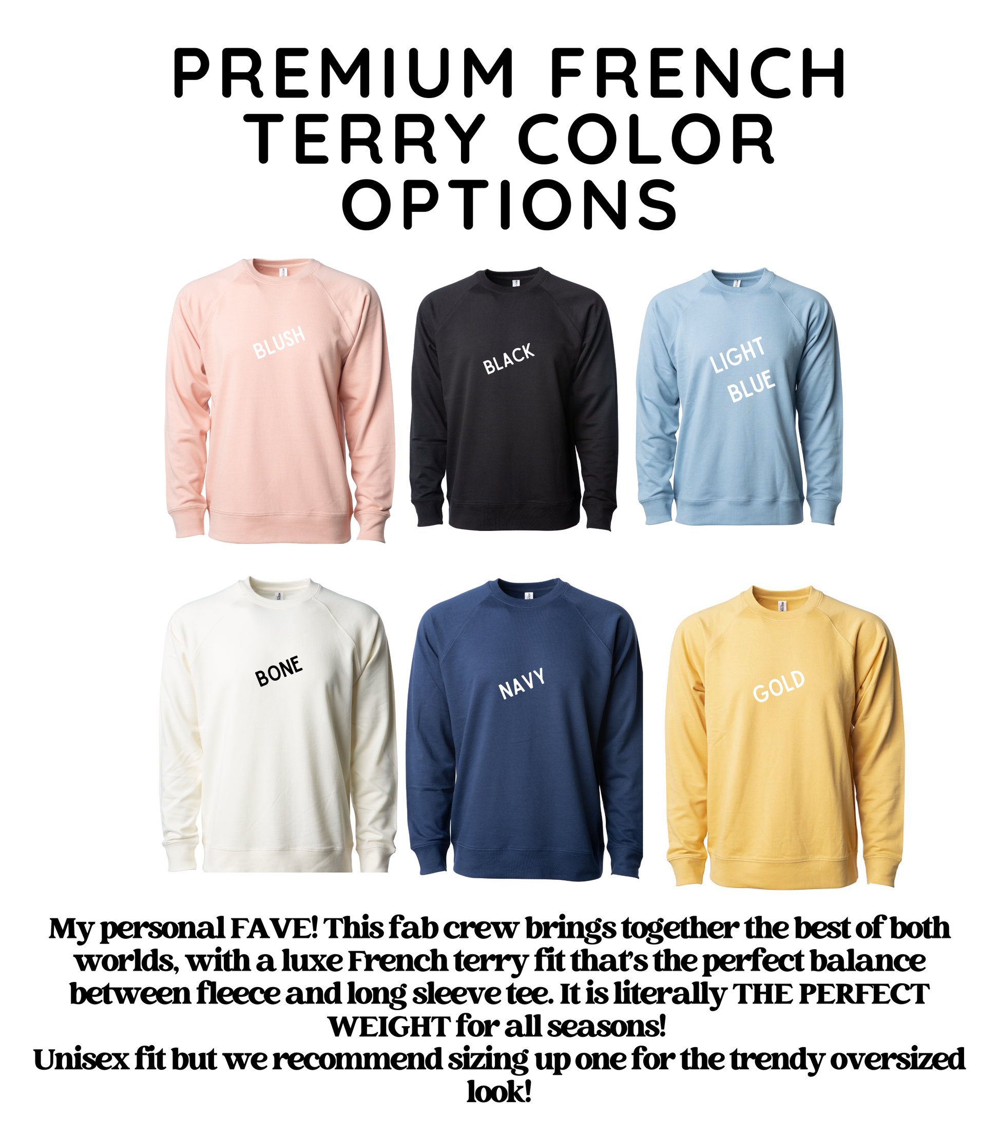Our Premium French Terry Crew. This fab crew brings together the best of both worlds, with a luxe French terry fit that's the perfect balance between fleece and long sleeve tee. Get ready to lounge in style, with legging length coverage and a unisex fit that we suggest sizing up in for the ultimate cozy experience. So comfy you won't wanna take it off!