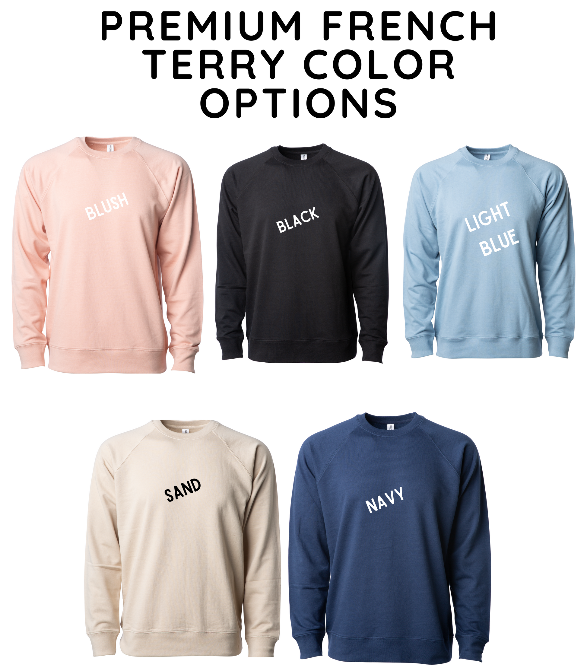 Our Premium French Terry Crew. This fab crew brings together the best of both worlds, with a luxe French terry fit that's the perfect balance between fleece and long sleeve tee. Get ready to lounge in style, with legging length coverage and a unisex fit that we suggest sizing up in for the ultimate cozy experience. So comfy you won't wanna take it off!