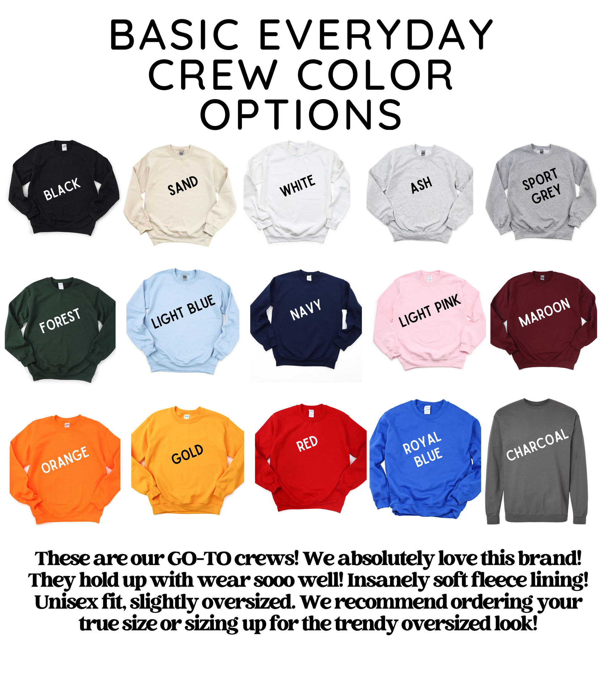 Our adult basic crews are regular unisex crew neck fleece sweatshirts. Both the crews and the hoodies will run slightly larger than normal women's sizes. We recommend ordering your normal size or size up for an oversized look!