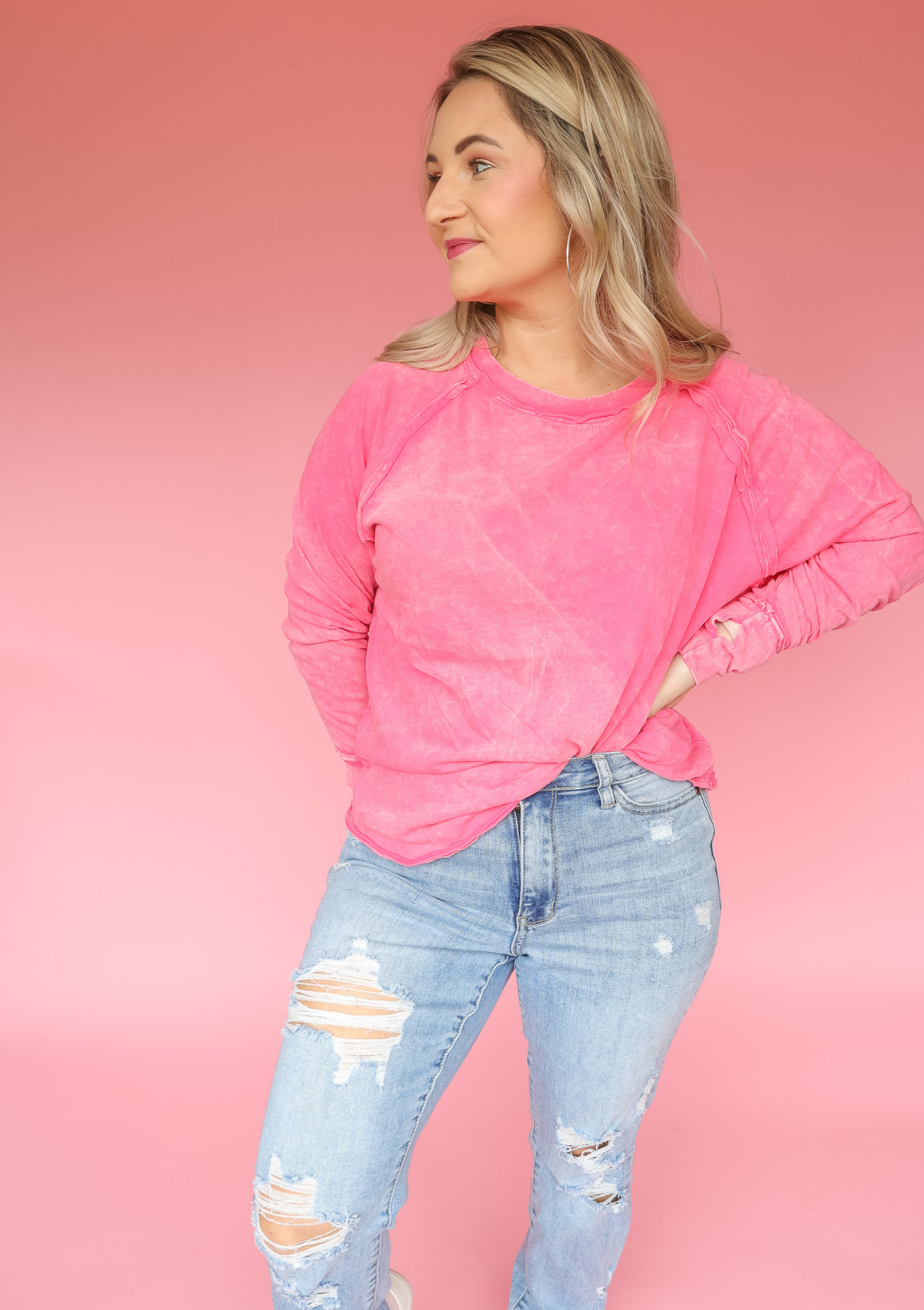 Stay on trend with our Easy On Me Washed Boat Neck Top! 🌸 This top features a boat neck design, thumb holes for added comfort, and a generous fit that is perfect for any body type. Make a statement with the beautiful spring pink color and stay trendy with this must-have top. 🎉