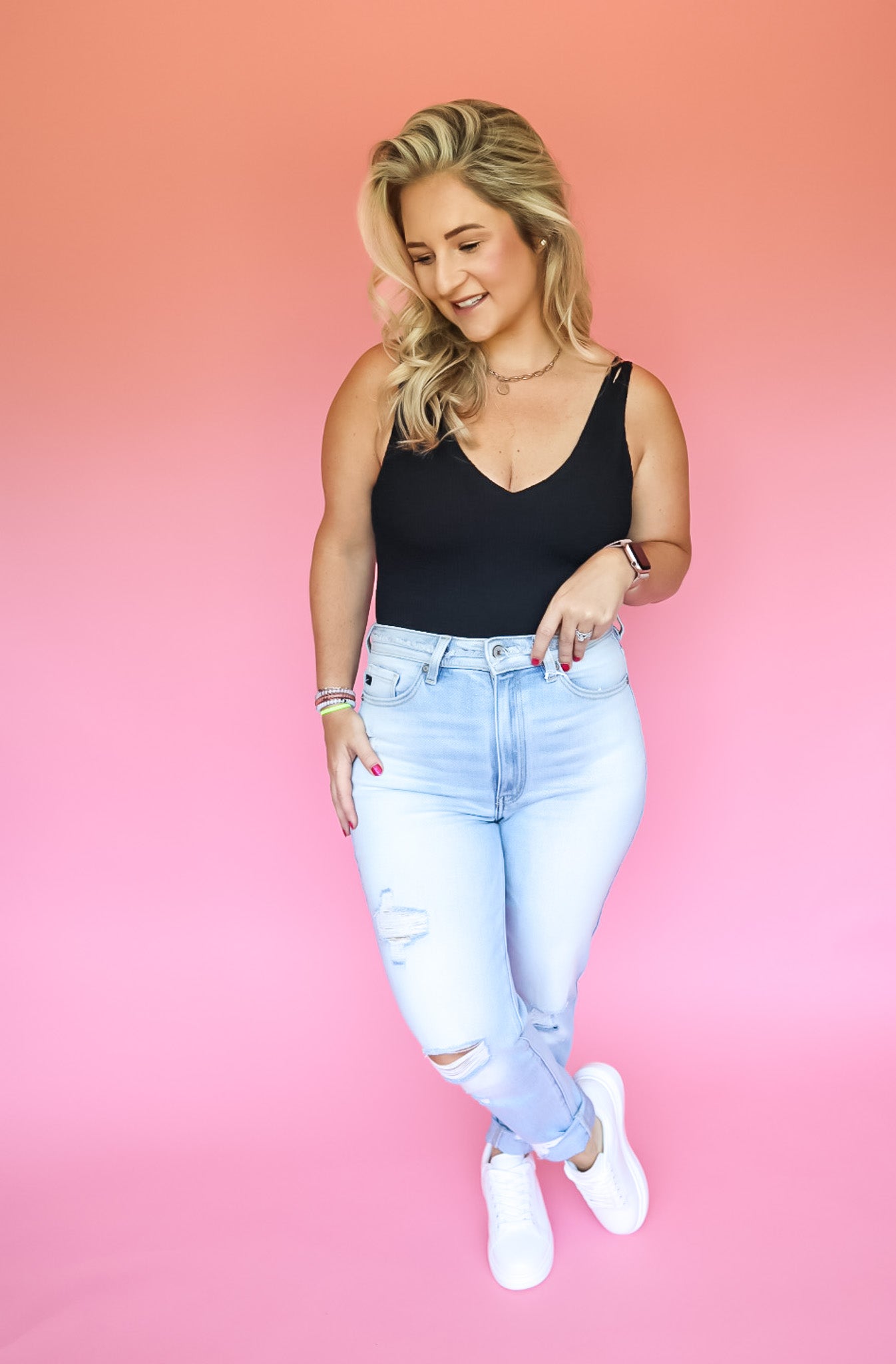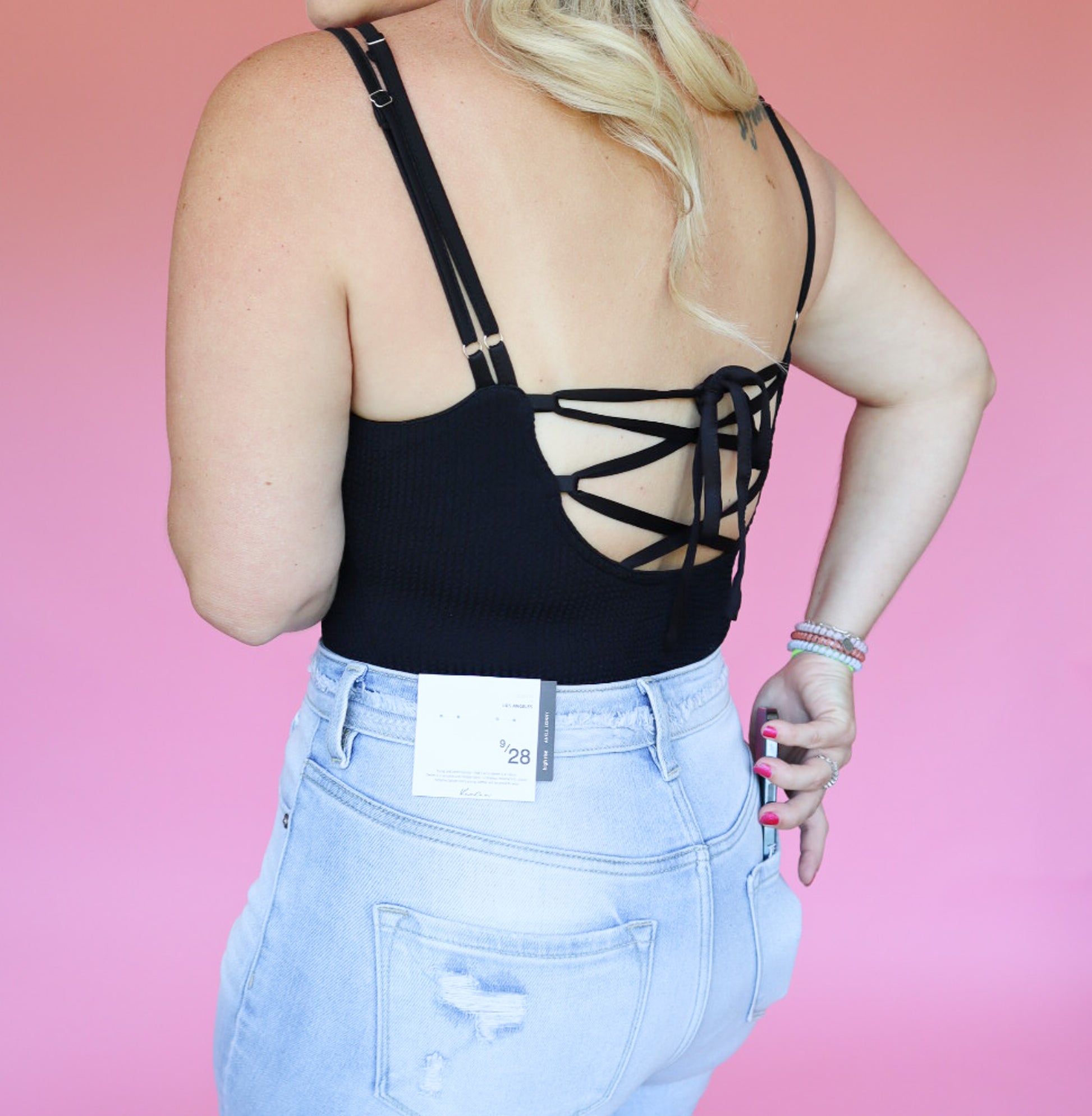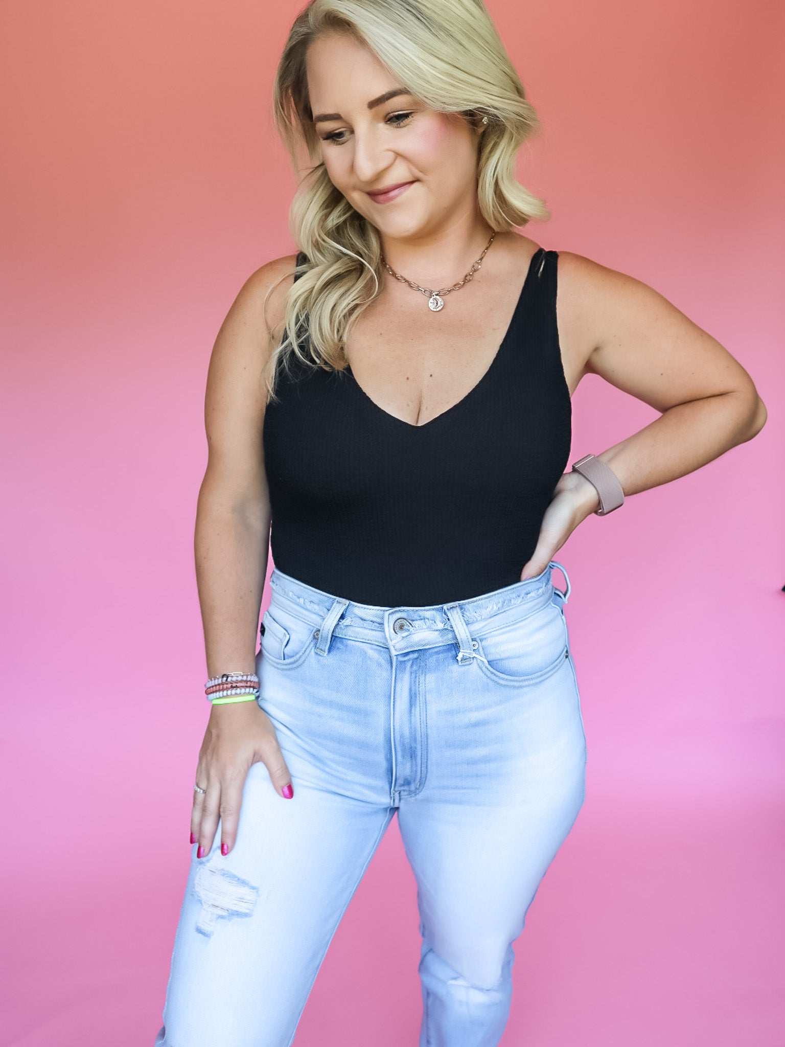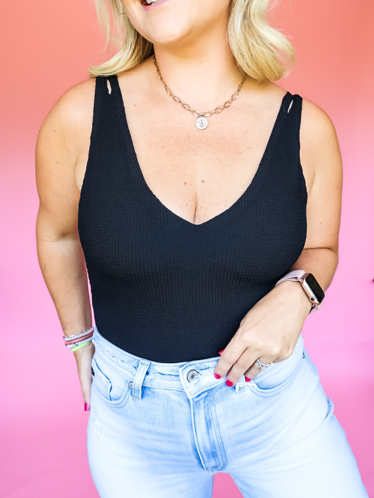 This bodysuit has it all! From its sleek sleeveless knit design, v-neck fit, and adjustable straps to its fancy criss-cross back, you'll look absolutely FINE in this fancy black bodysuit! Classy, fashionable, and comfy - what more could you want? Get your hands on it ASAP!