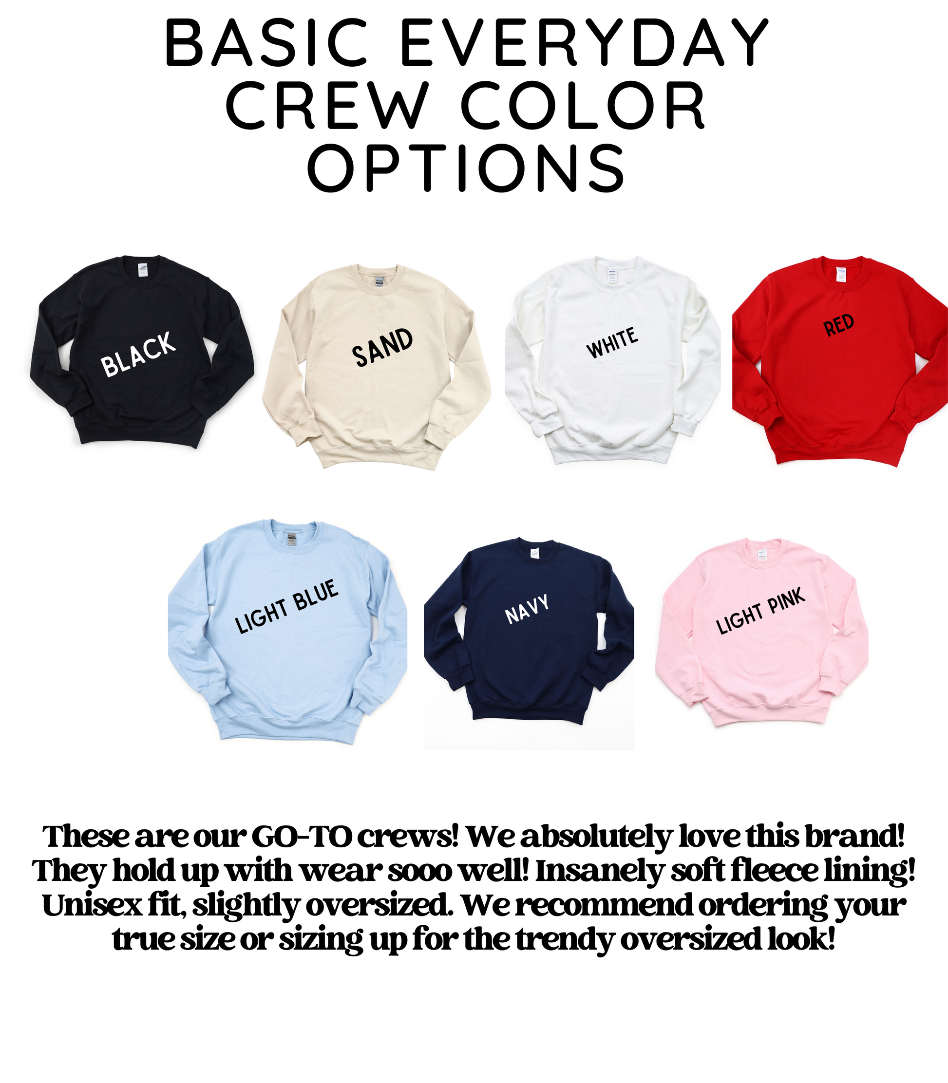 Our adult basic crews are regular unisex crew neck fleece sweatshirts. Both the crews and the hoodies will run slightly larger than normal women's sizes. We recommend ordering your normal size or size up for an oversized look!
