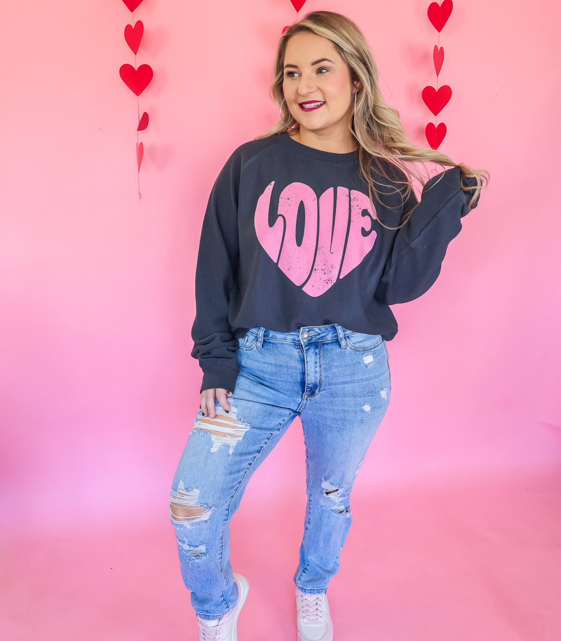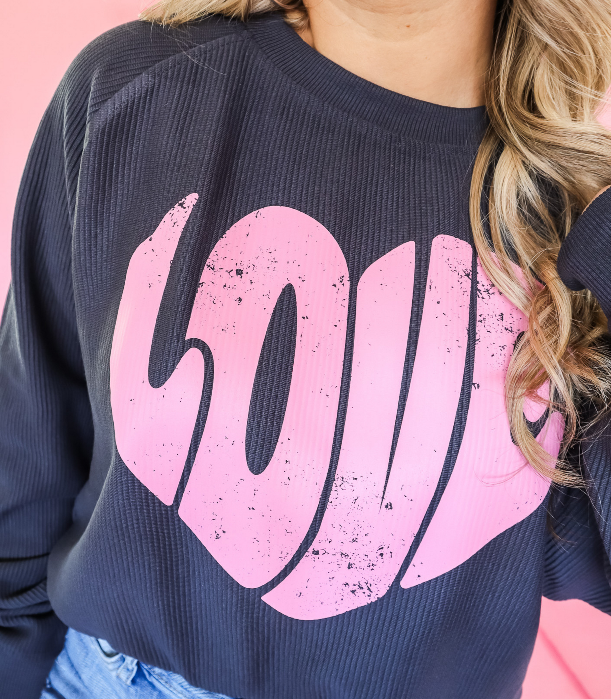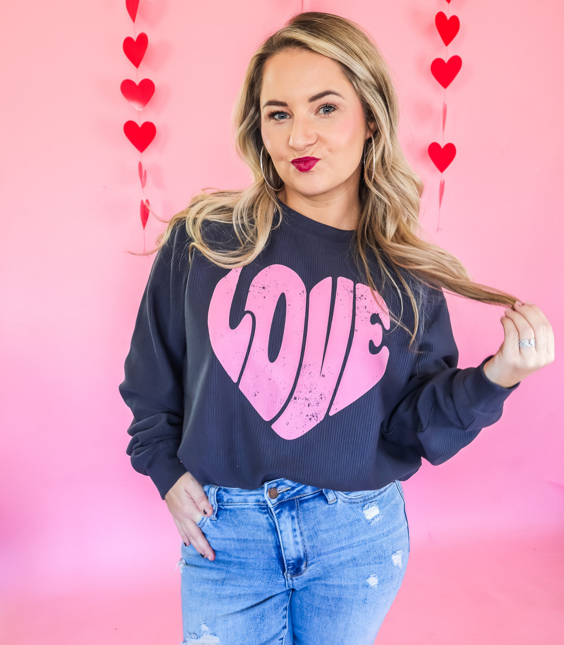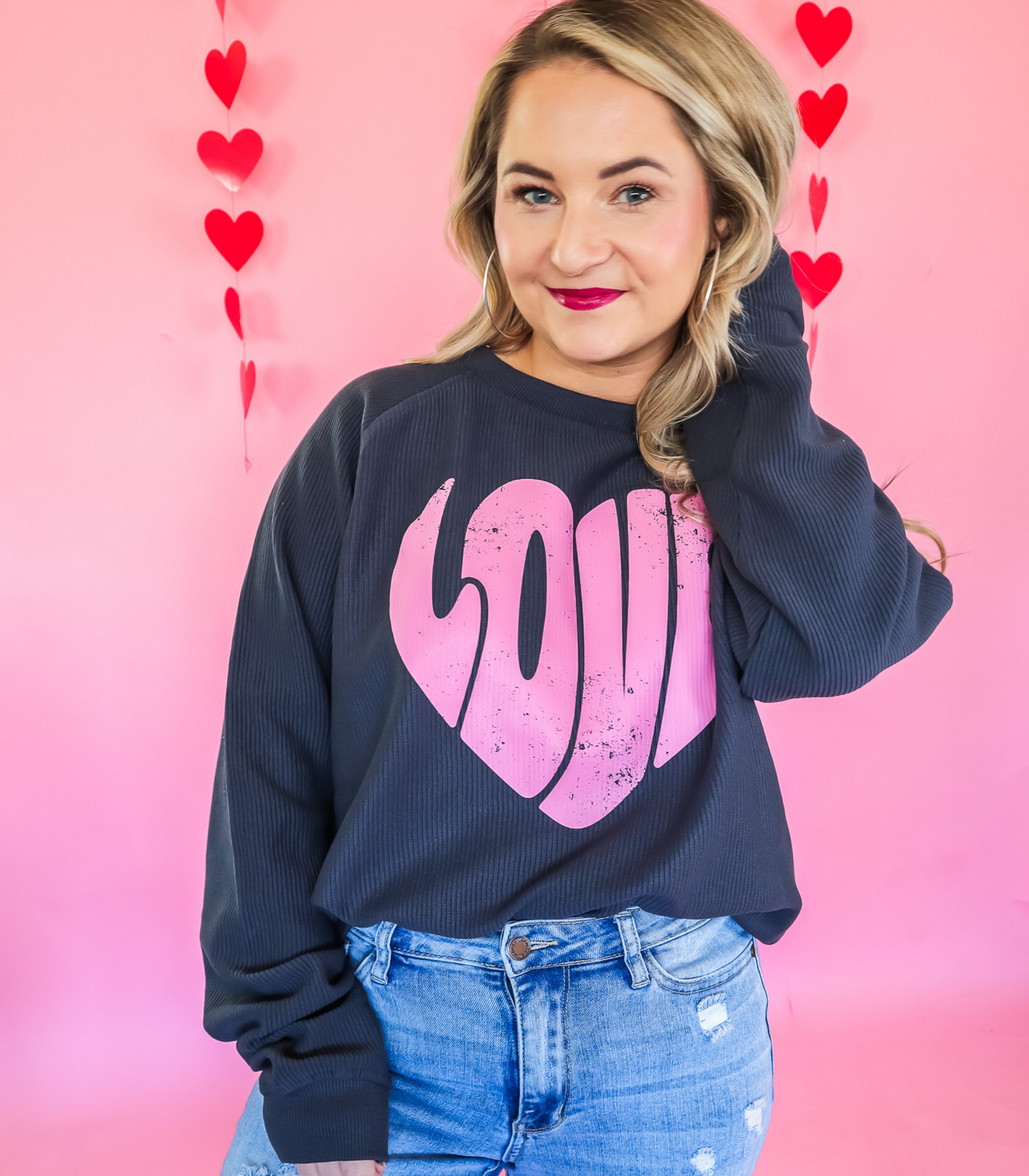 FIRST UP, is our modern corded crew! This relaxed-fit, hip length shirt is perfect for any Valentine's Day celebration. Made from a soft blend of cotton and poly, it features easy decoration, raglan sleeves, and ribbed cuffs and bottom. Share the love! Fit is true to size!
