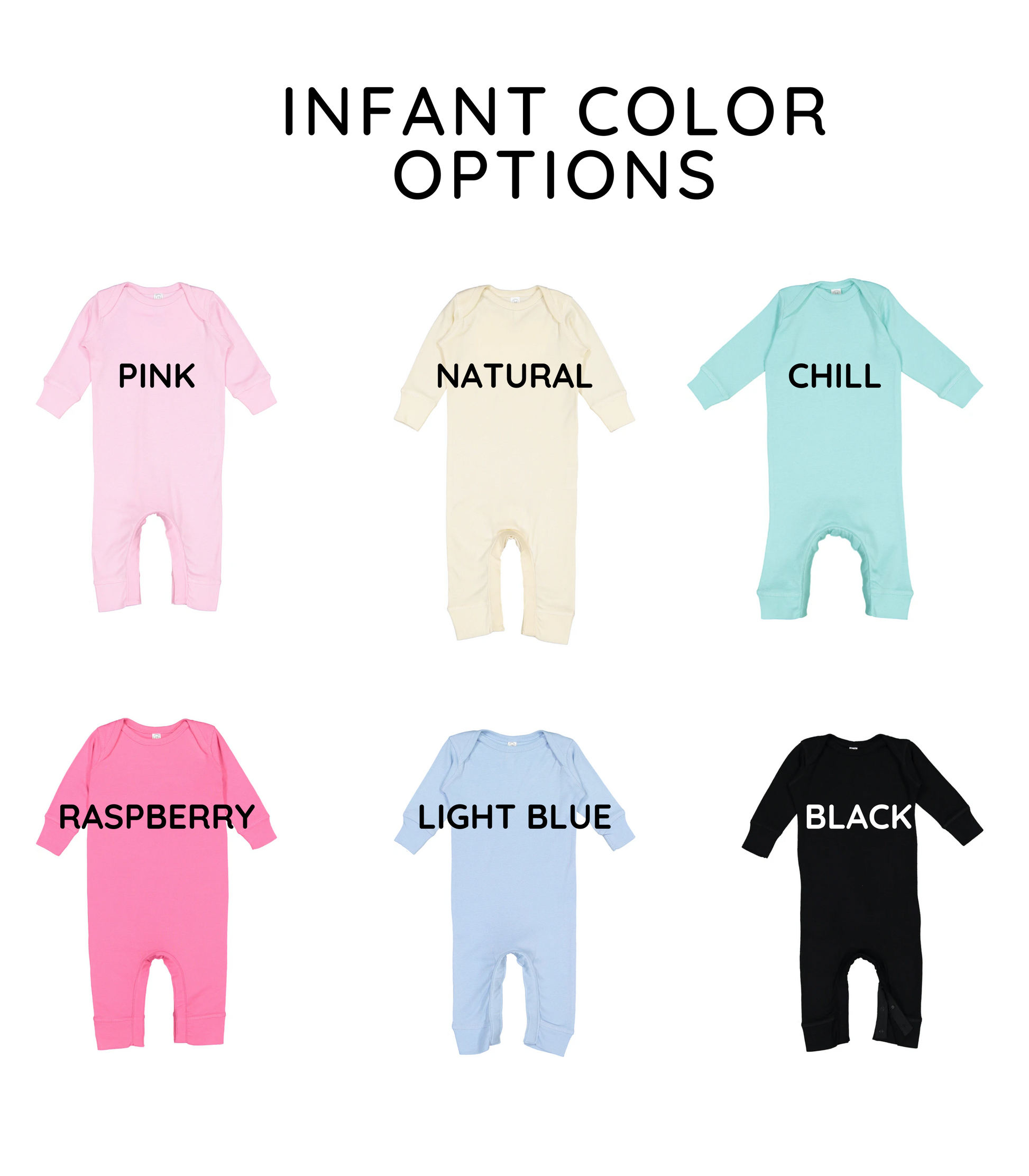 We are so EXCITED to introduce our infant line with our infant coverall, which will be long sleeve and down the legs complete with a reinforced snap closure.