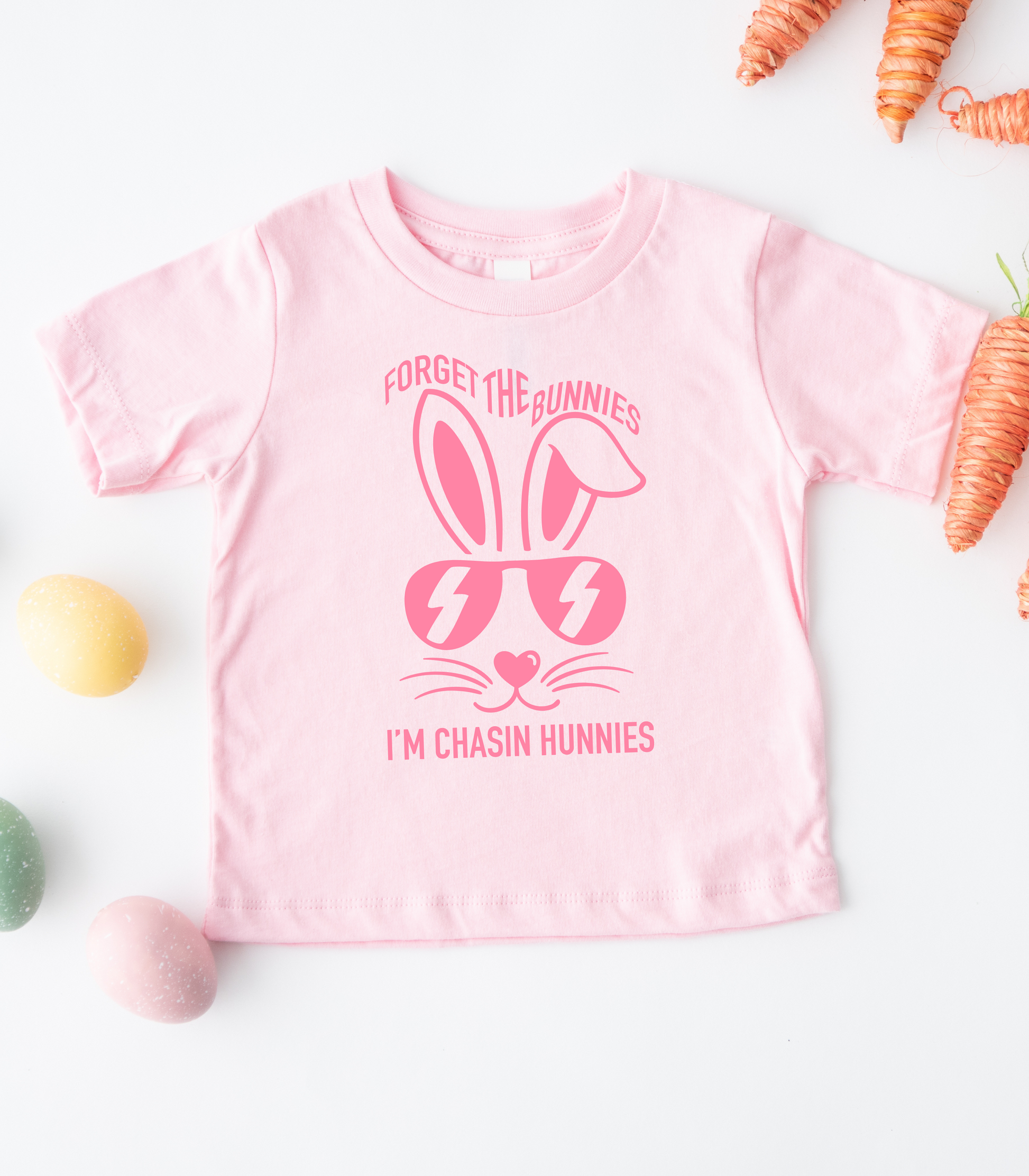 KIDS PINK FORGET THE BUNNIES I'M CHASIN HUNNIES TEE