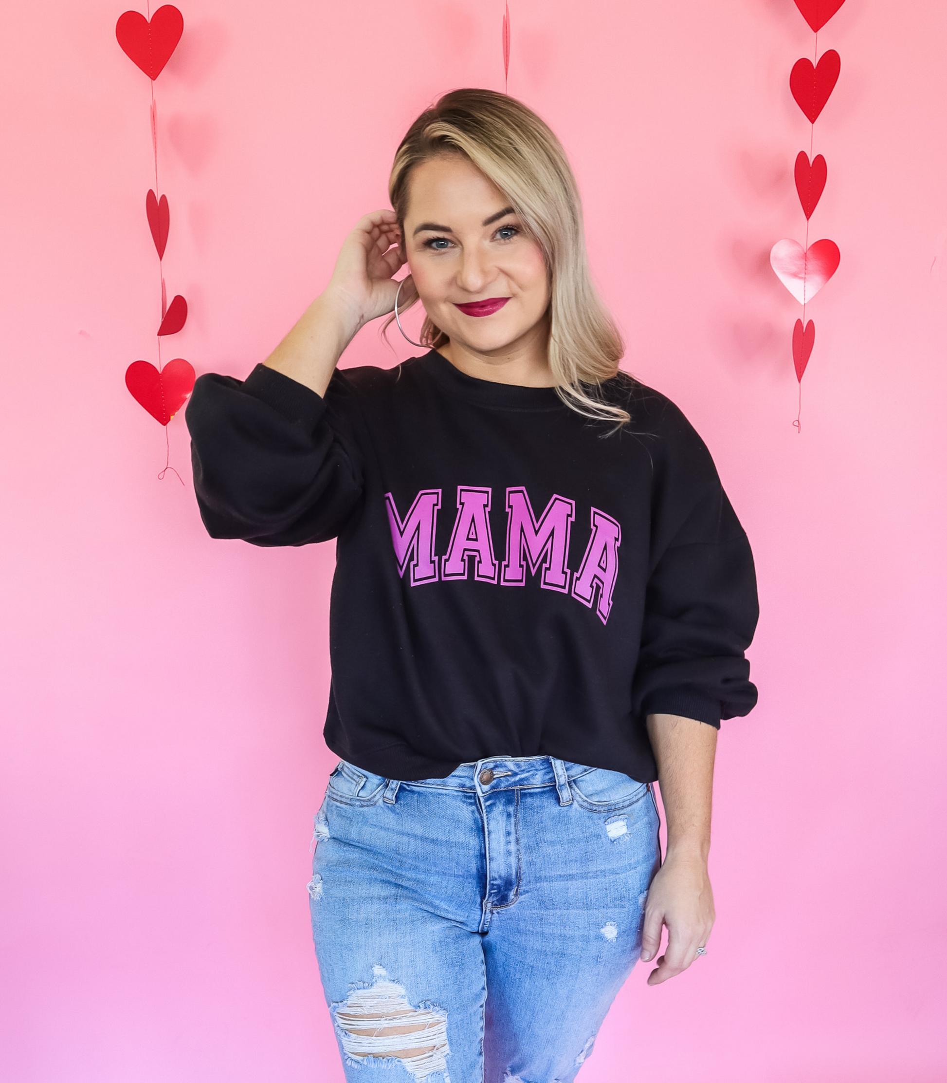 FIRST UP, is our BALLOON SLEEVE CREW! Be the MVP of Valentine's Day with the VARSITY MAMA sweatshirt. Its balloon-shape sleeve and drop shoulders bring unique, sporty style while the rib cuff and bottom provide a comfortable fit. Made of a soft, cotton-poly blend, it's perfect for game day or date night. FIT IS RELAXED, WE RECOMMEND ORDERING YOUR TRUE SIZE!