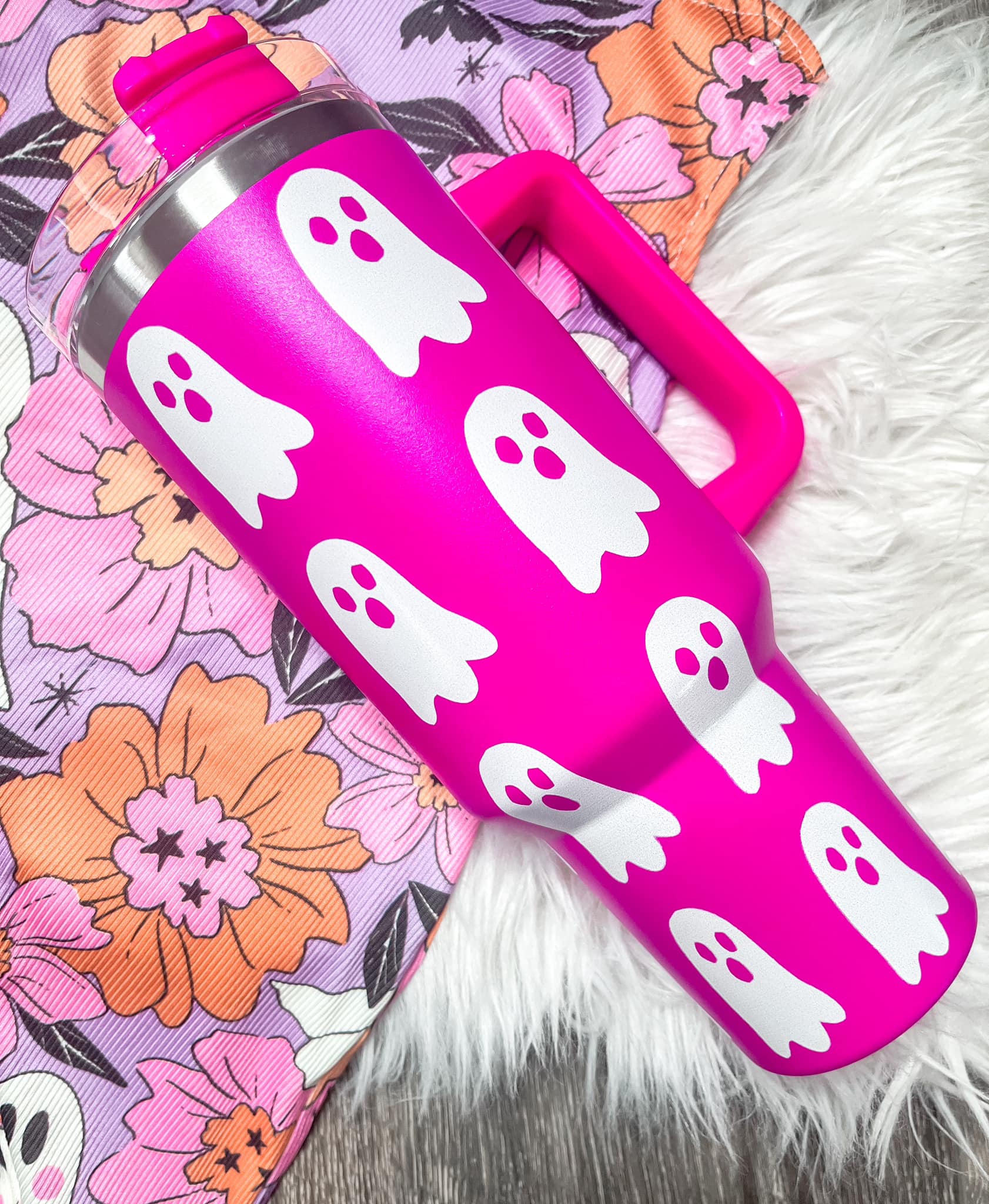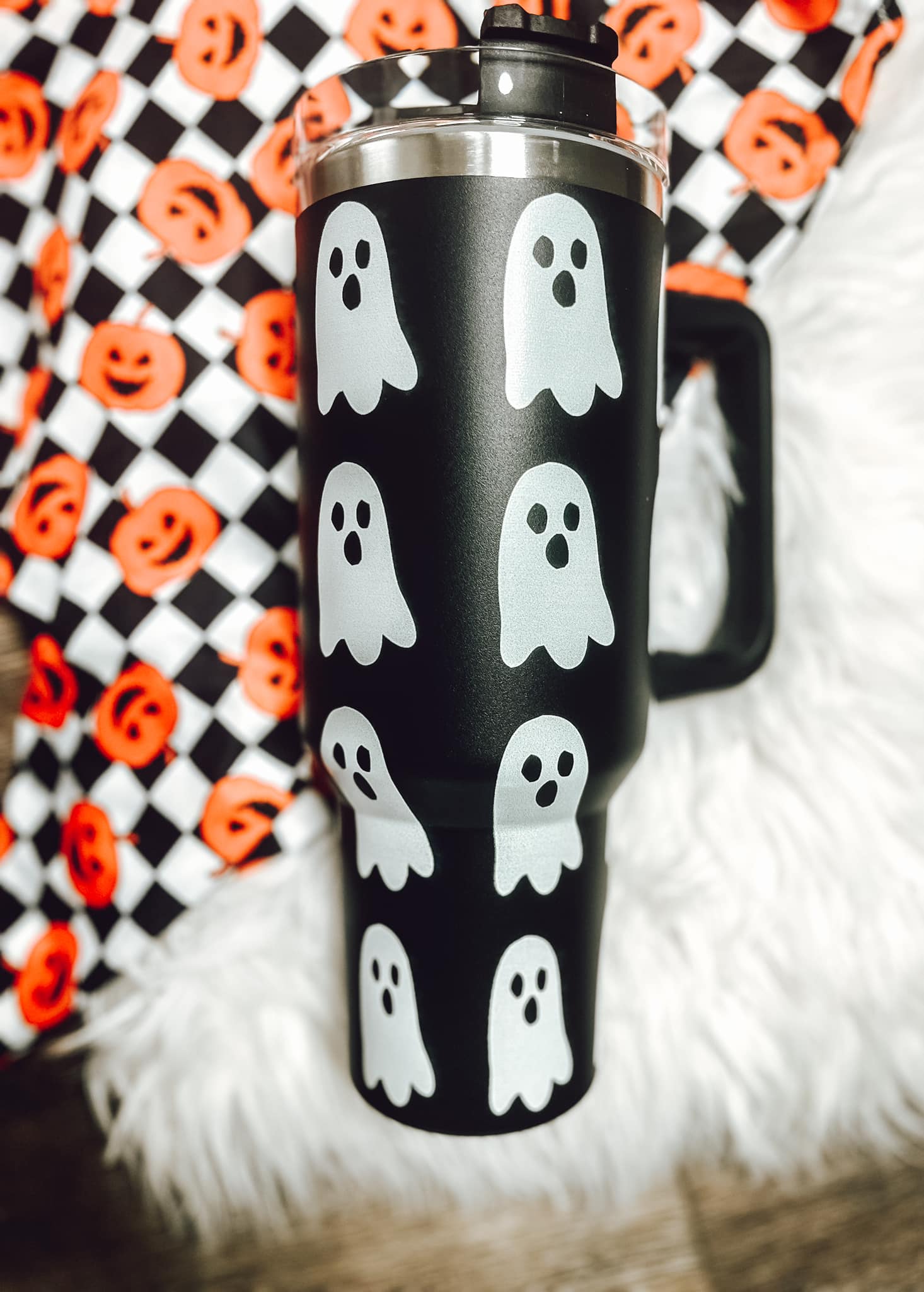 Stay hydrated on the go with our 40 oz stainless steel ghost tumbler! The anti-spill top and included straw make it perfect for hot or cold drinks. Plus, it fits in standard car holders and is top shelf dishwasher safe. Quench your thirst in style, with a playful twist.