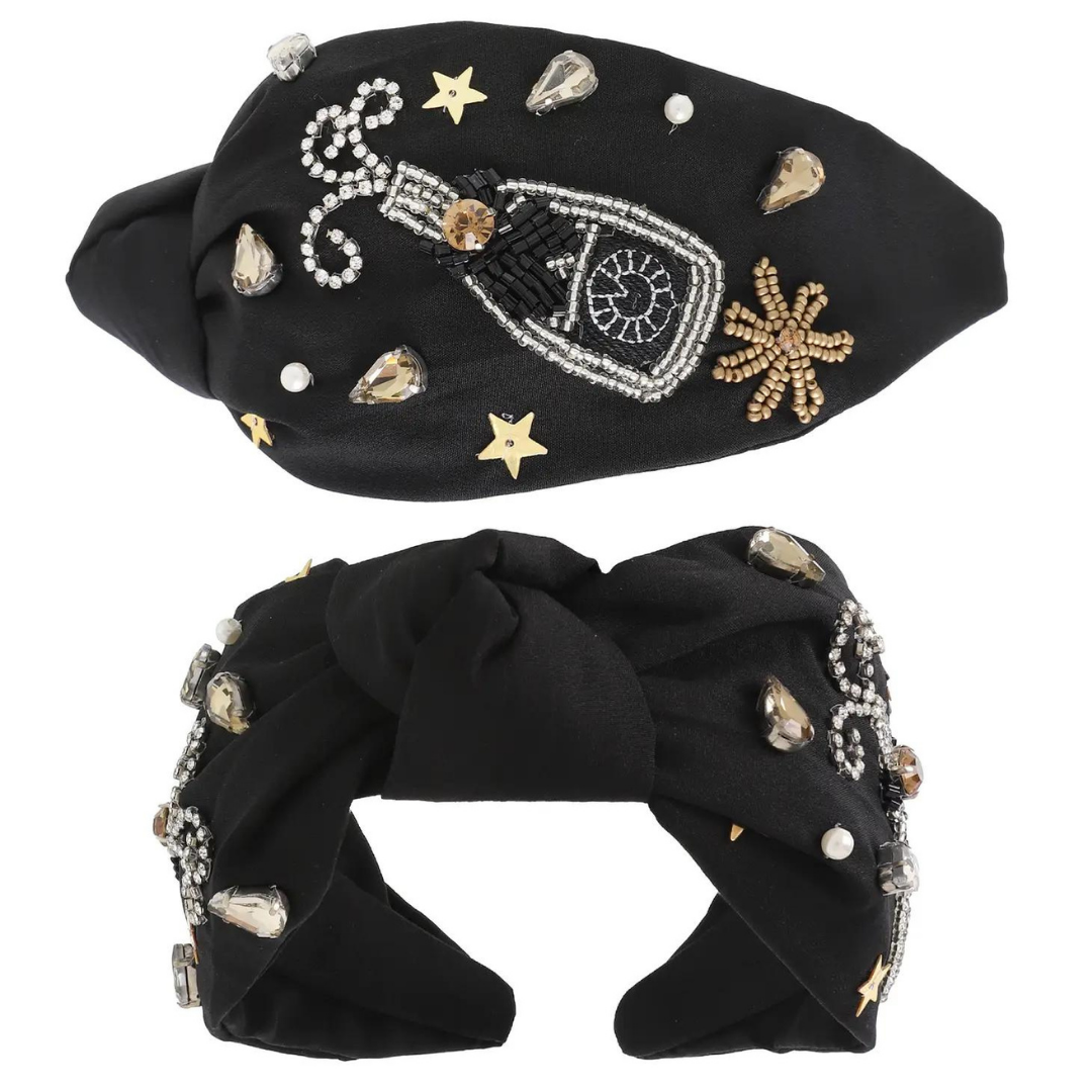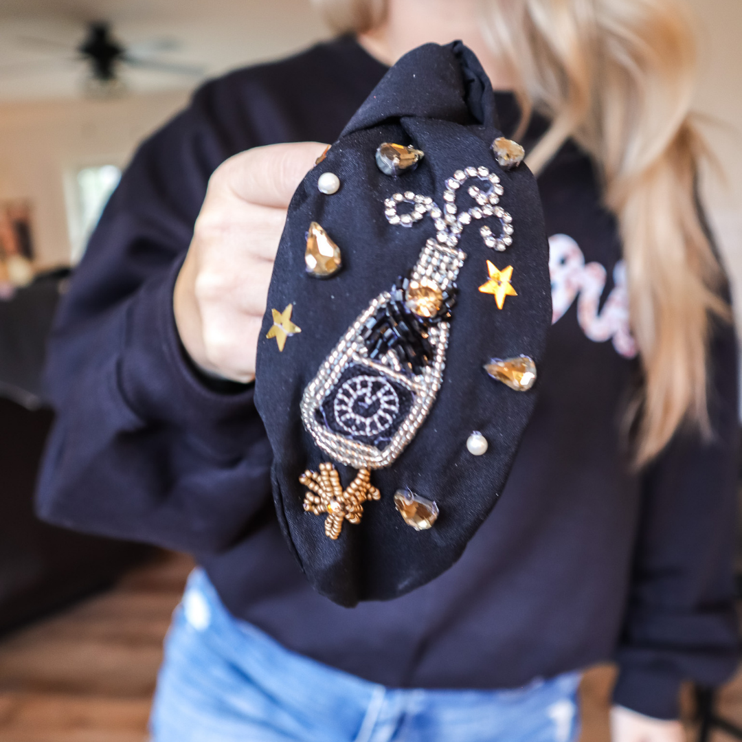 Celebrate in style with our BOTTLES POPPIN BEADED HEADBAND! This festive headband is perfect for New Year's Eve, with its beaded design that adds some fun and sparkle to your outfit. Make a statement and stand out from the crowd with this must-have accessory.
